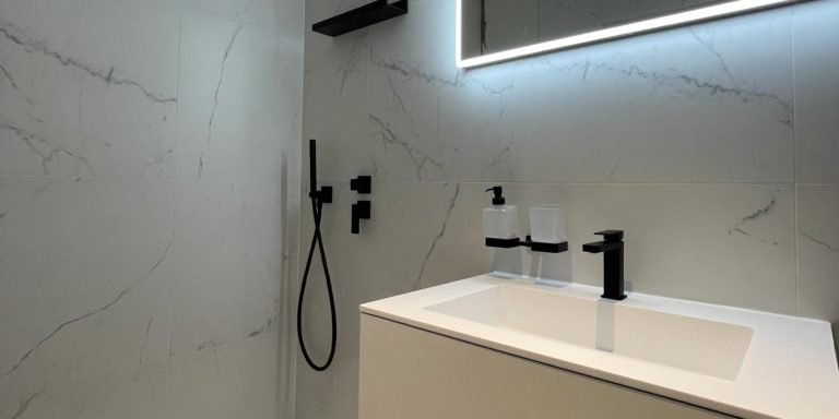 Élégance Contrastée: Transformation d’une Salle de Bain avec Robinetterie Noire sur Marbre Blanc La rénovation de cet appartement a conduit à une transformation radicale de