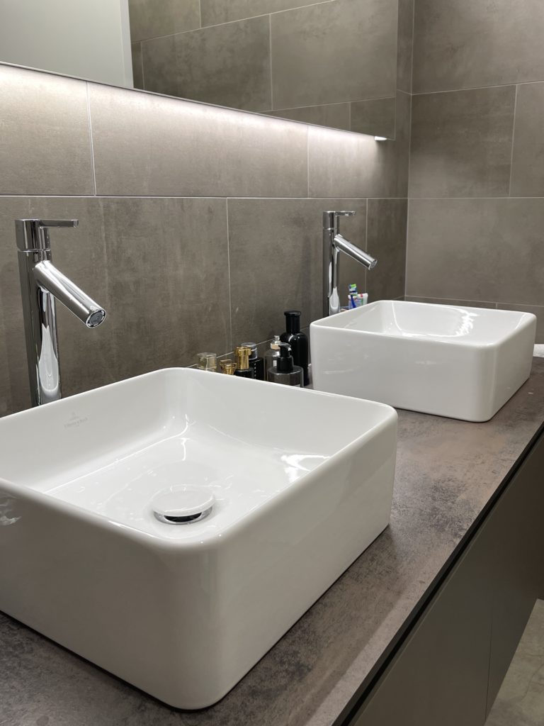 En parallèle, Grosch a également pris en charge l’aménagement d’un WC séparé, doté d’un simple lavabo, pour offrir une solution élégante et efficace aux besoins quotidiens. Cette pièce, bien que plus compacte, ne fait aucun compromis sur la qualité et l’esthétique, suivant les mêmes standards élevés de design et de fonctionnalité que la salle de douche principale. L’utilisation de matériaux de qualité supérieure et d’un design cohérent à travers les deux espaces assure une harmonie visuelle et une durabilité à long terme.