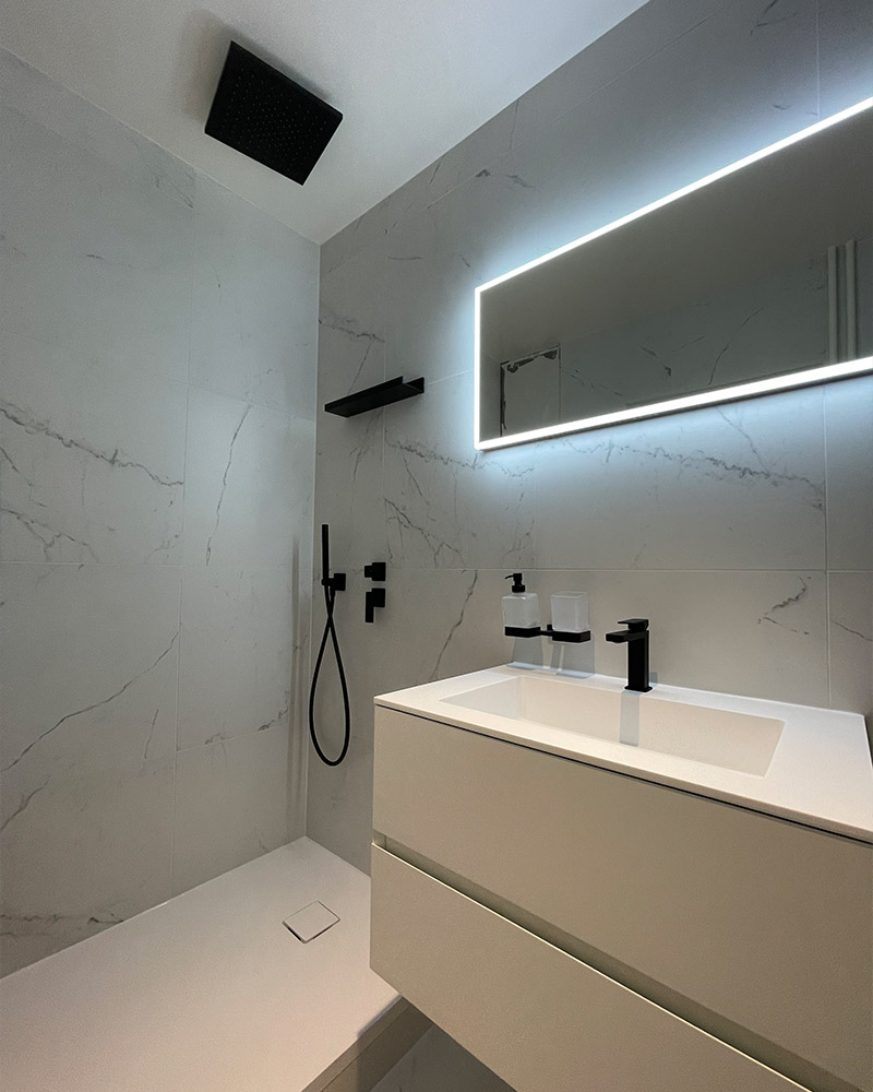 La rénovation de cet appartement a conduit à une transformation radicale de la salle de bain, suite à la démolition de certaines cloisons pour repenser entièrement l’espace. Notre équipe a relevé le défi de concevoir un nouvel agencement qui maximise l’utilisation de chaque élément, fusionnant fonctionnalité et esthétisme dans un cadre réinventé.
