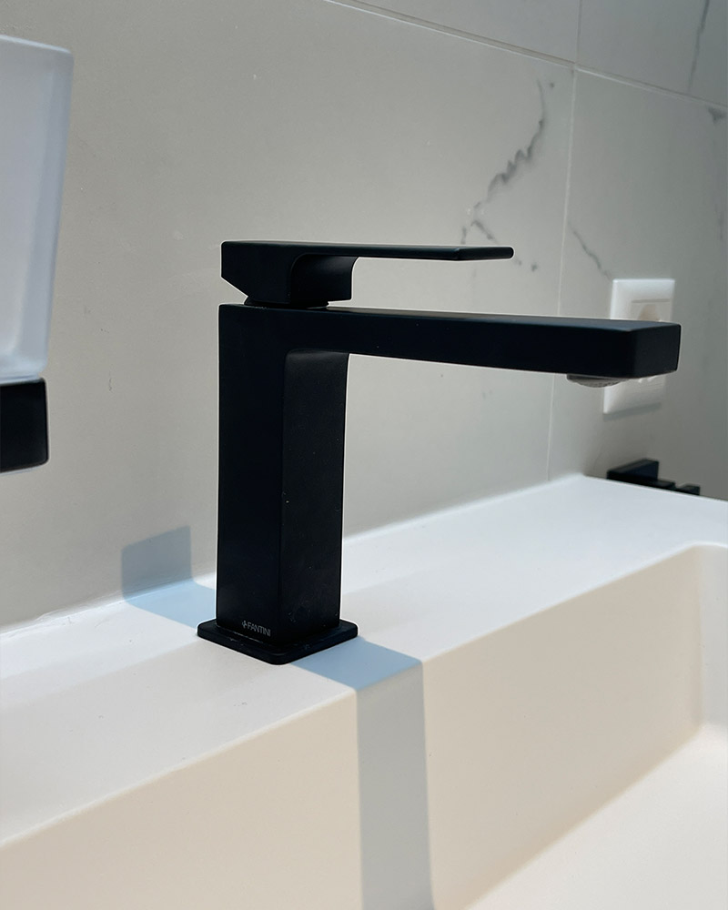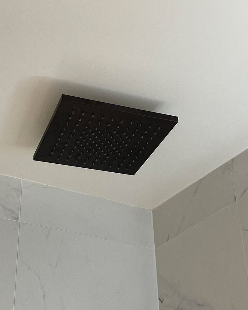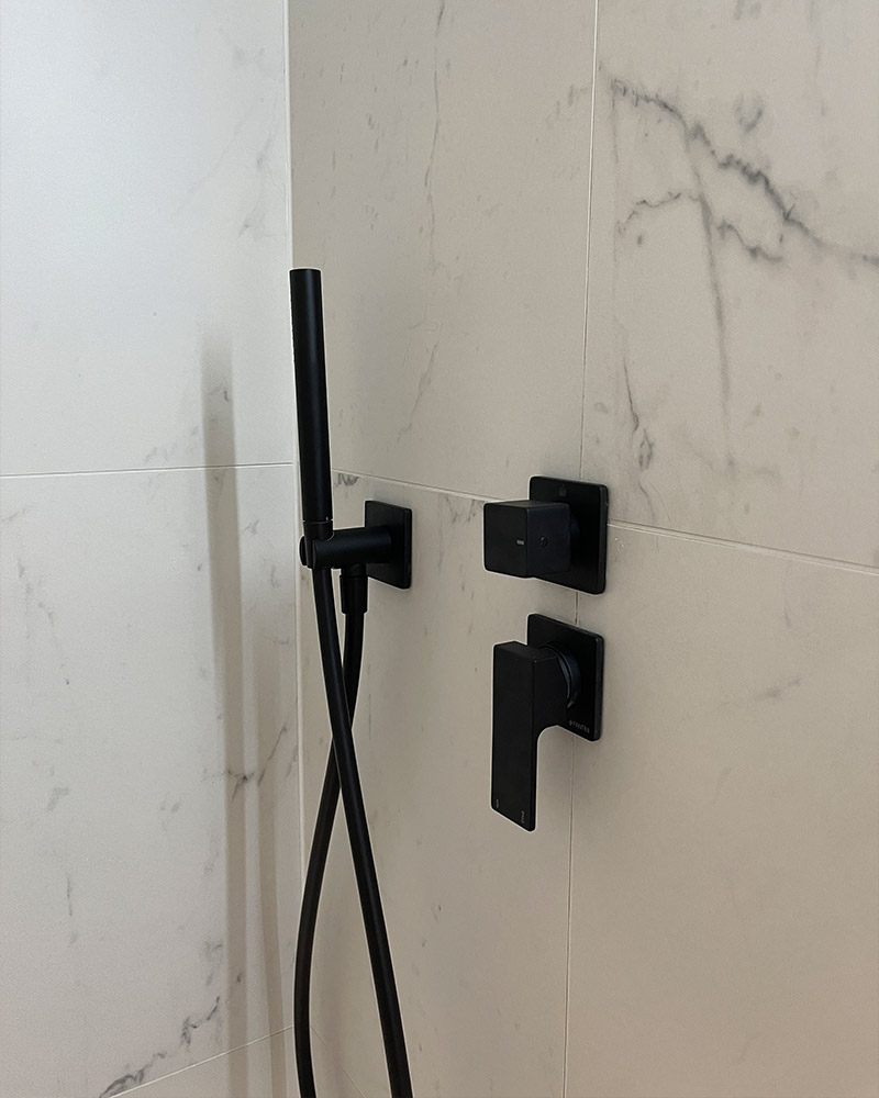 L’installation de robinetterie encastrée noire, choisie pour son élégance et sa modernité, crée un contraste frappant avec le carrelage marbré, apportant une touche de sophistication à l’ensemble. Ce mariage de couleurs et de textures souligne l’attention portée aux détails et à la qualité, caractéristiques de notre approche du design intérieur.